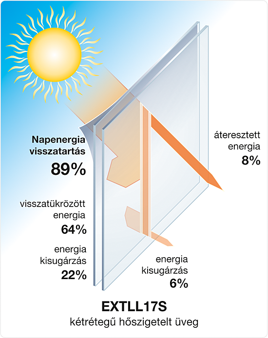 4 - 16 - 4 LOW - E ARG 1.1 kW / m2 hőszigetelő üveggel.